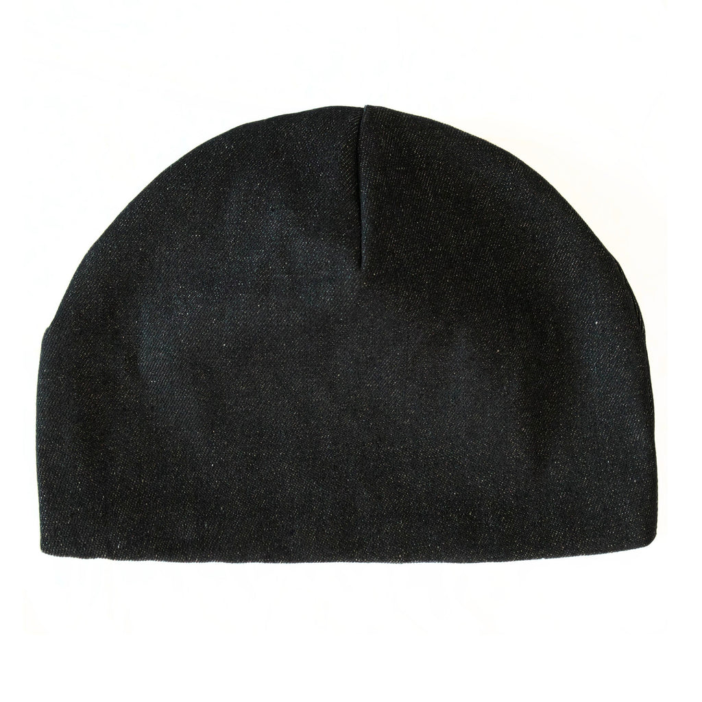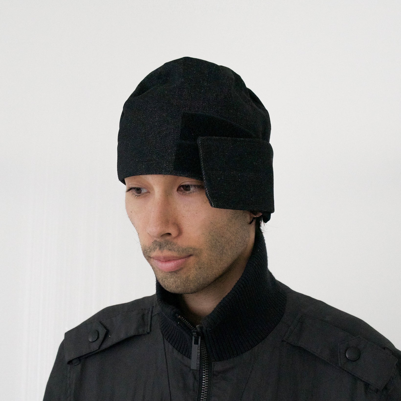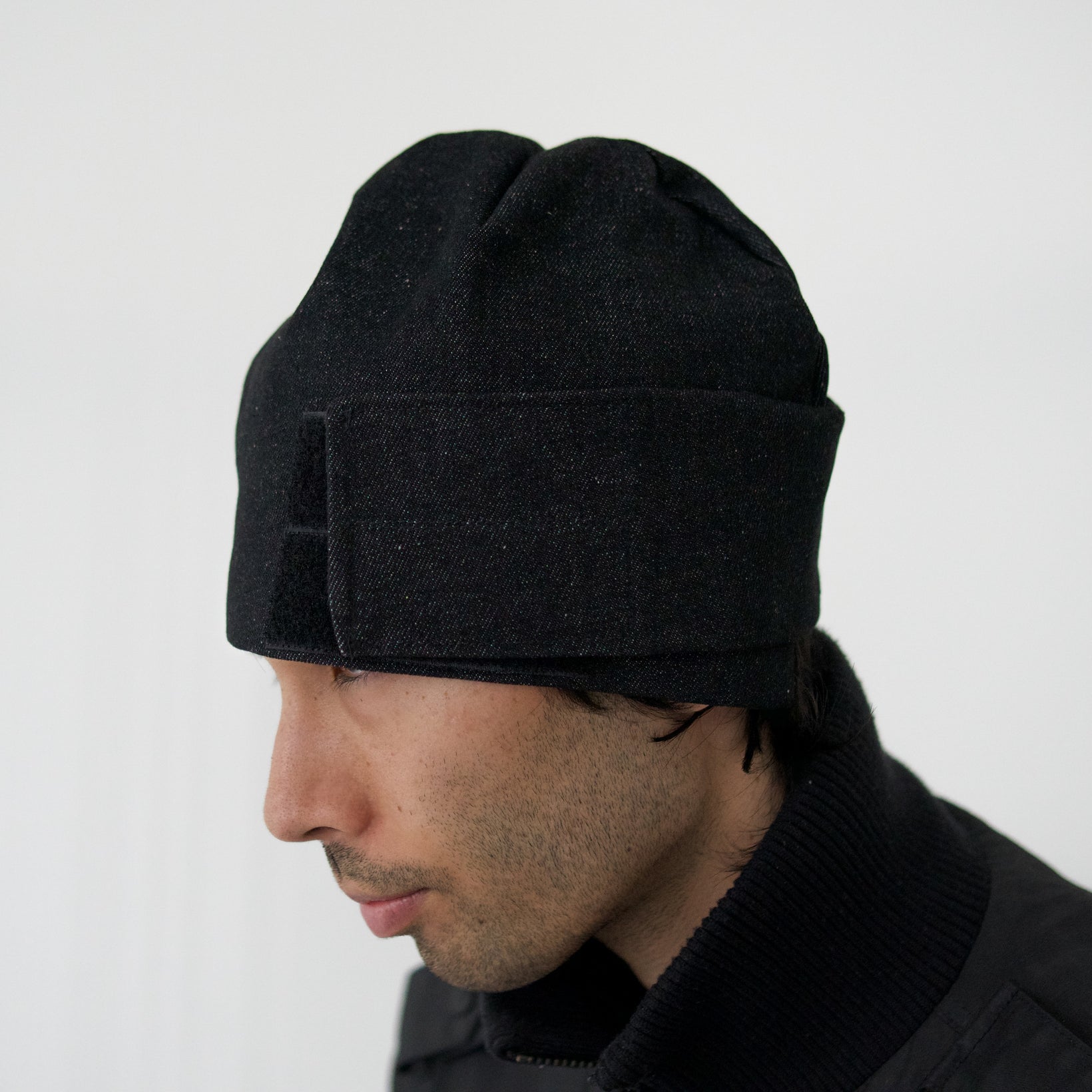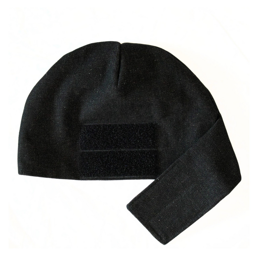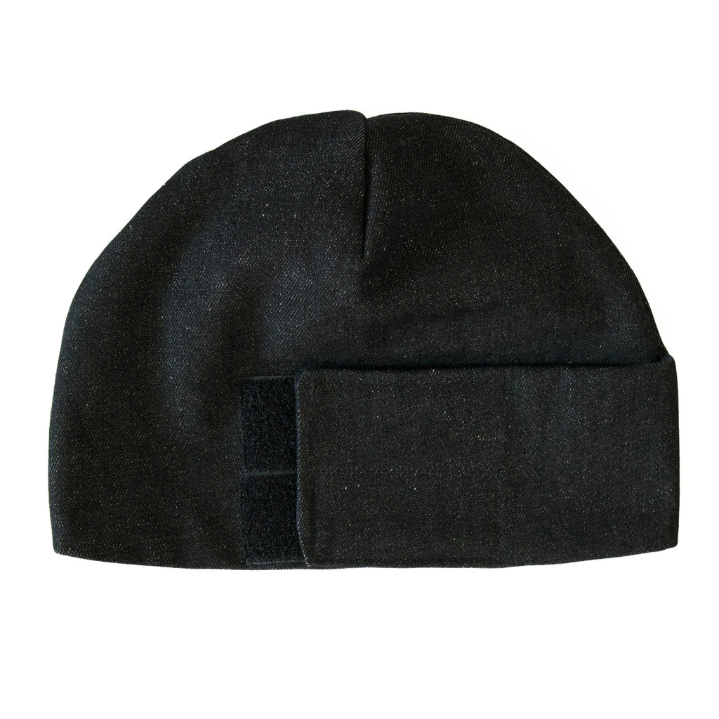 Adjustable wrap around velcro strap.Black mid-weight non stretch denim, soft black stretch jersey lining.