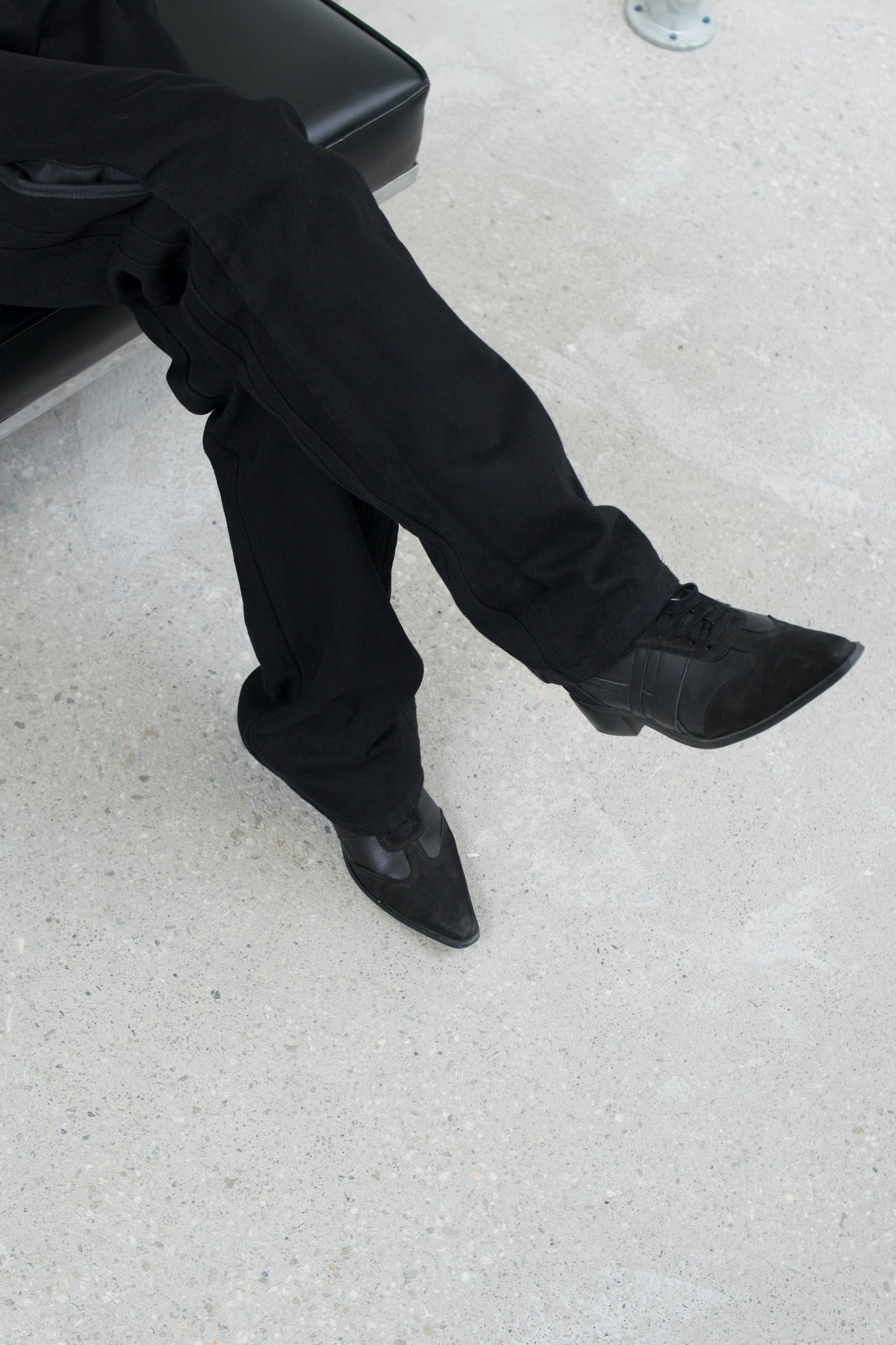 Low profile lace up crafted in black pebbled leather and matte nubuck. Pointed toe, subtle panel detailing, and a slightly raised heel. Fits true to size.
