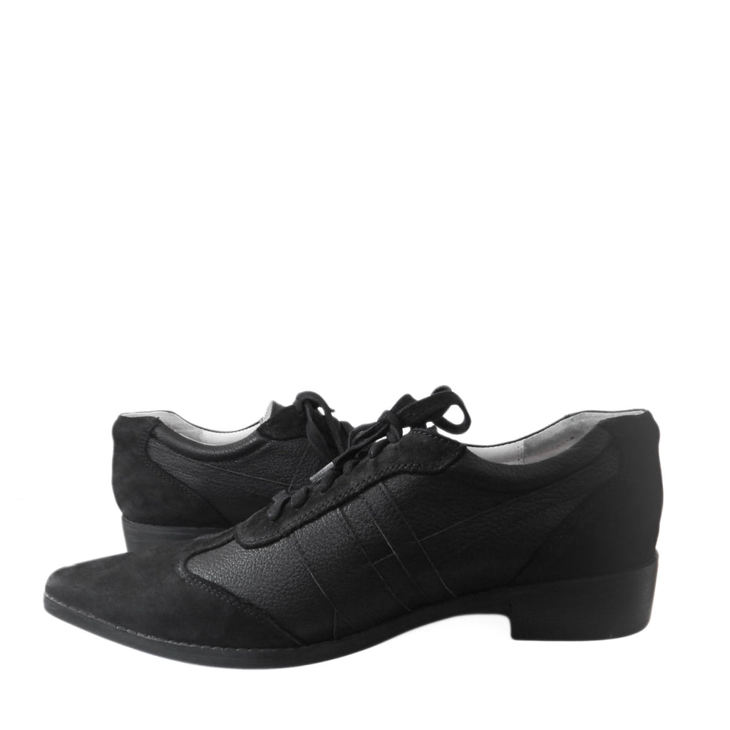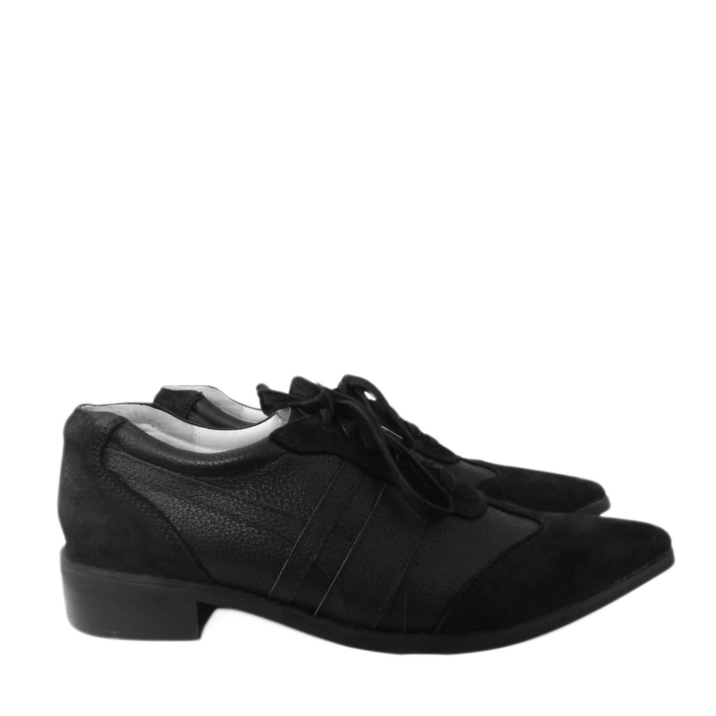 Low profile lace up crafted in black pebbled leather and matte nubuck. Pointed toe, subtle panel detailing, and a slightly raised heel. Fits true to size.