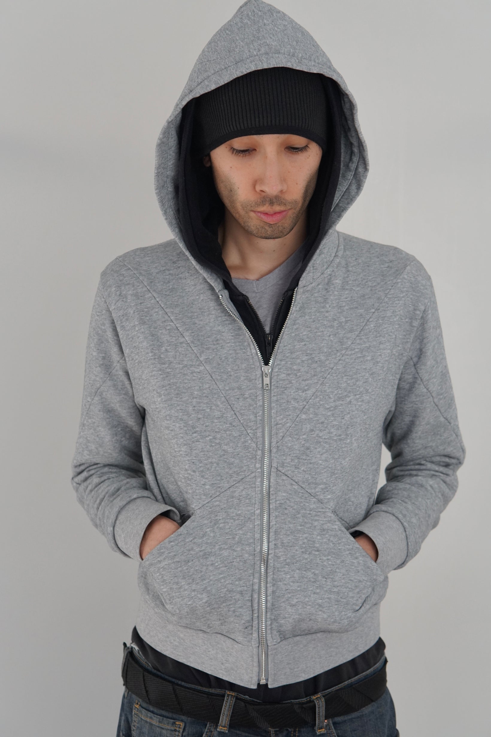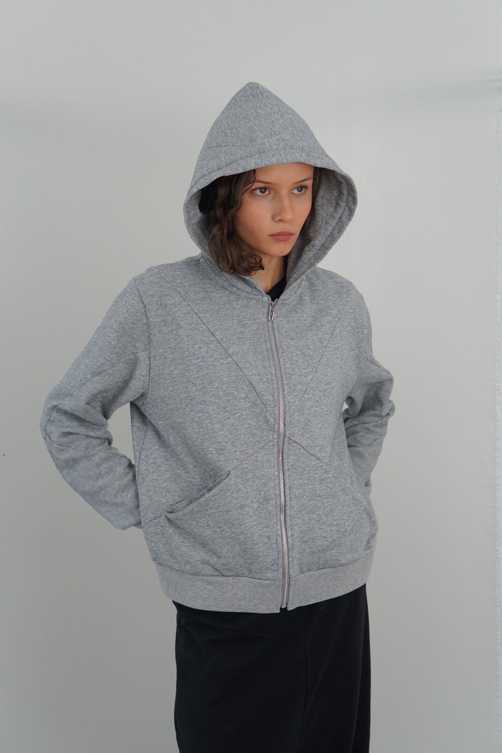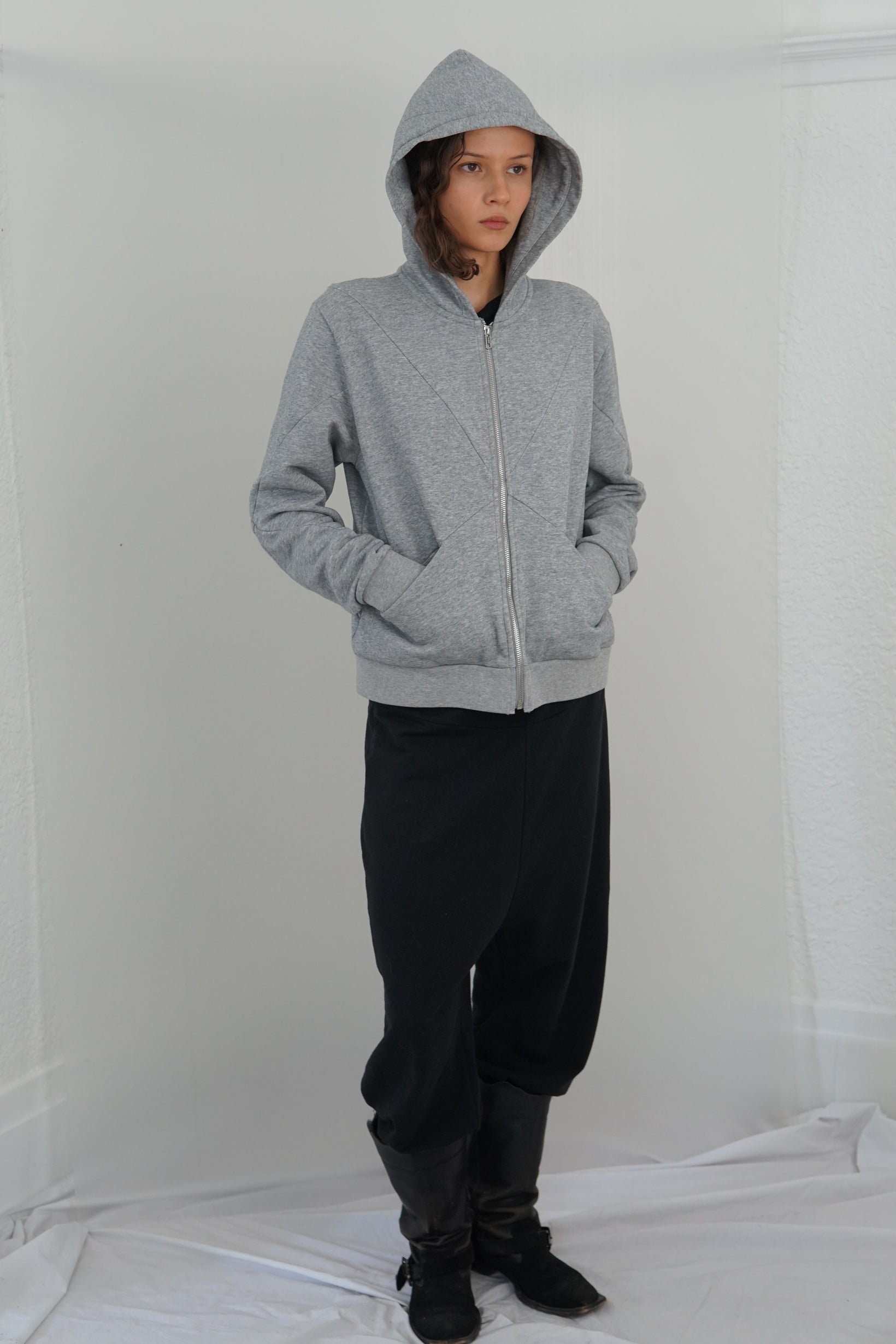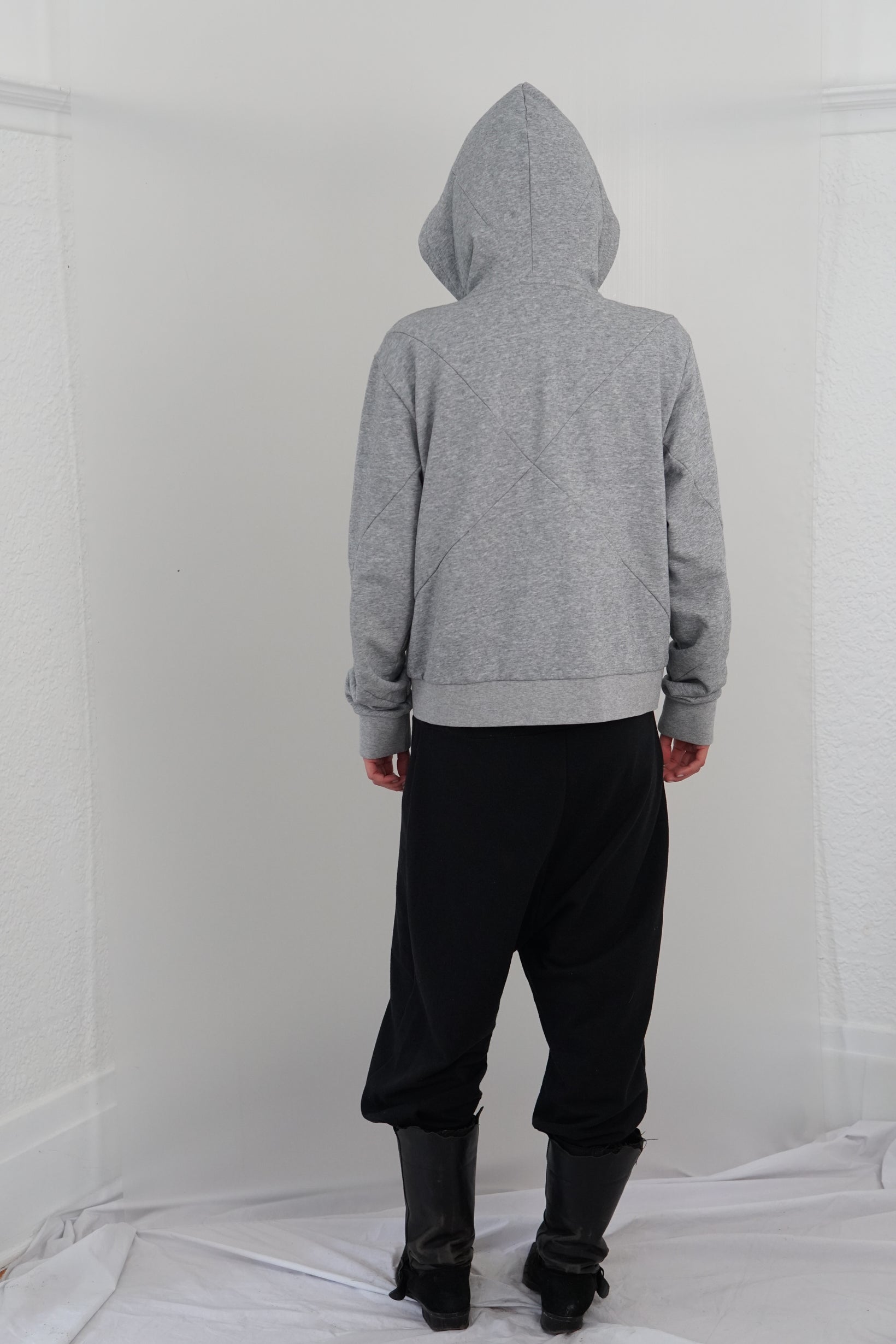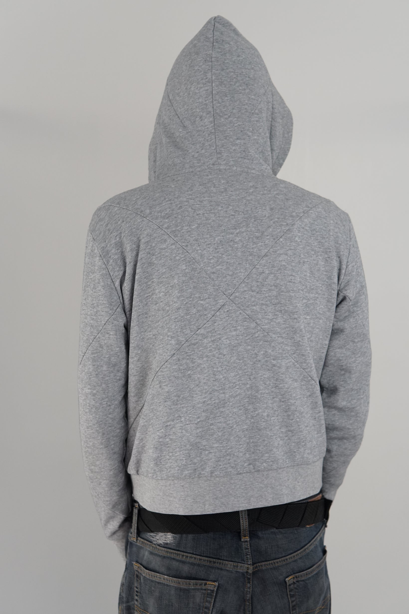 Mid-weight terry loop hoodie with "x" details on front, back, hood & sleeves. Straight fit, semi cropped.