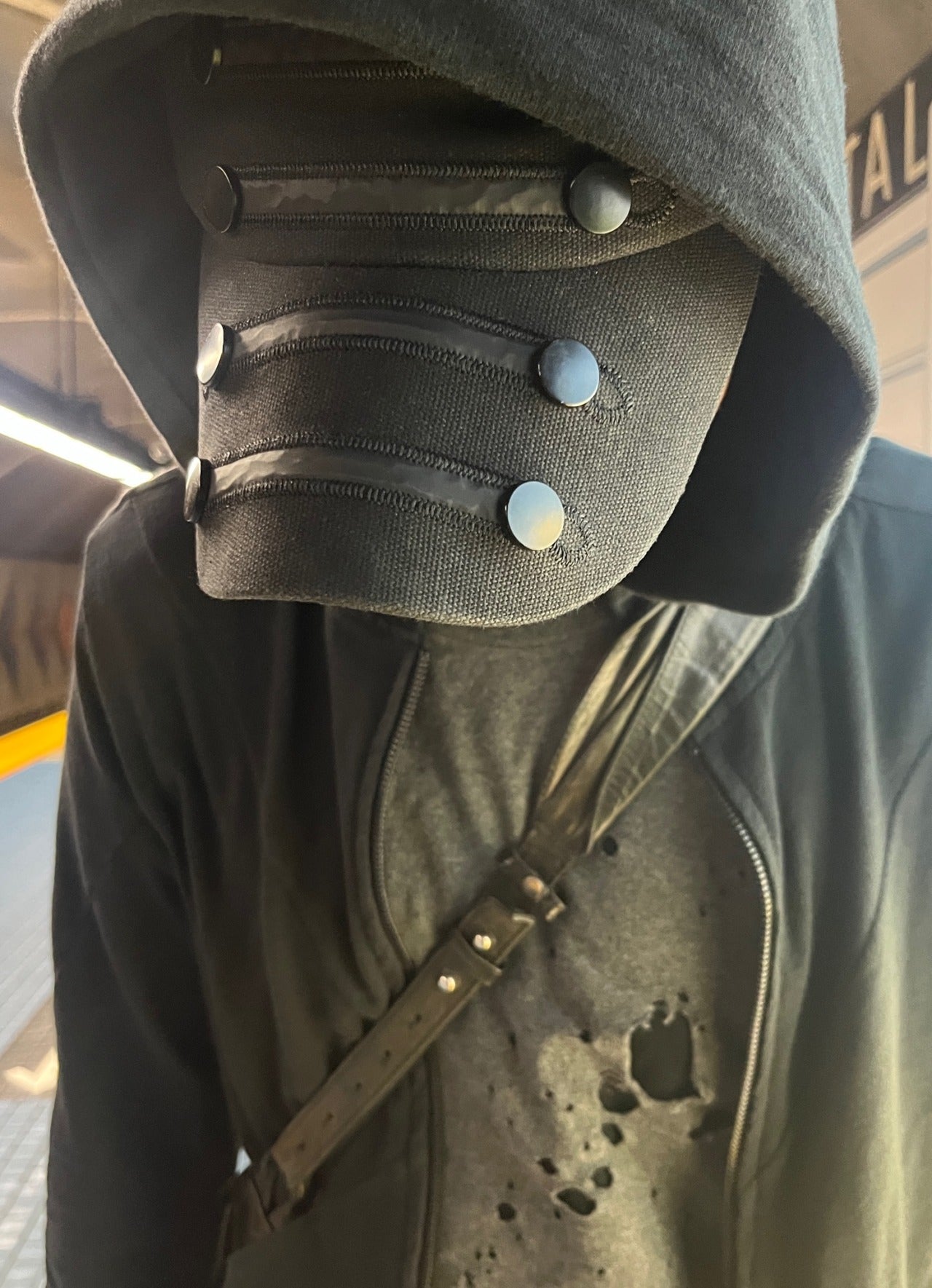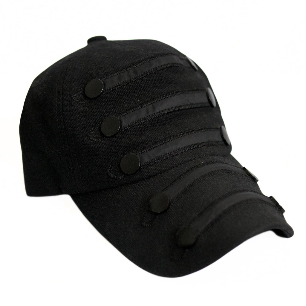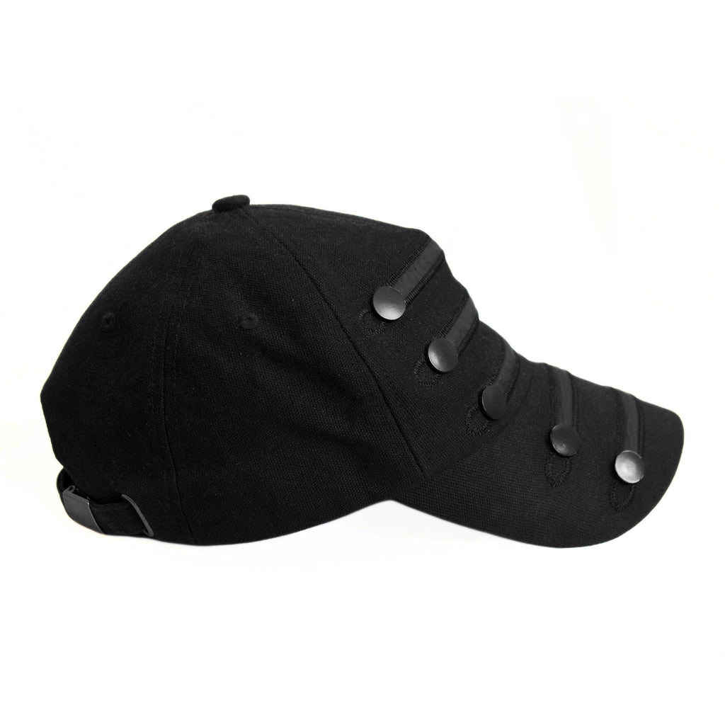 Black chainstitch embroidery, shiny nylon laser cut insert, black coloured rivets.