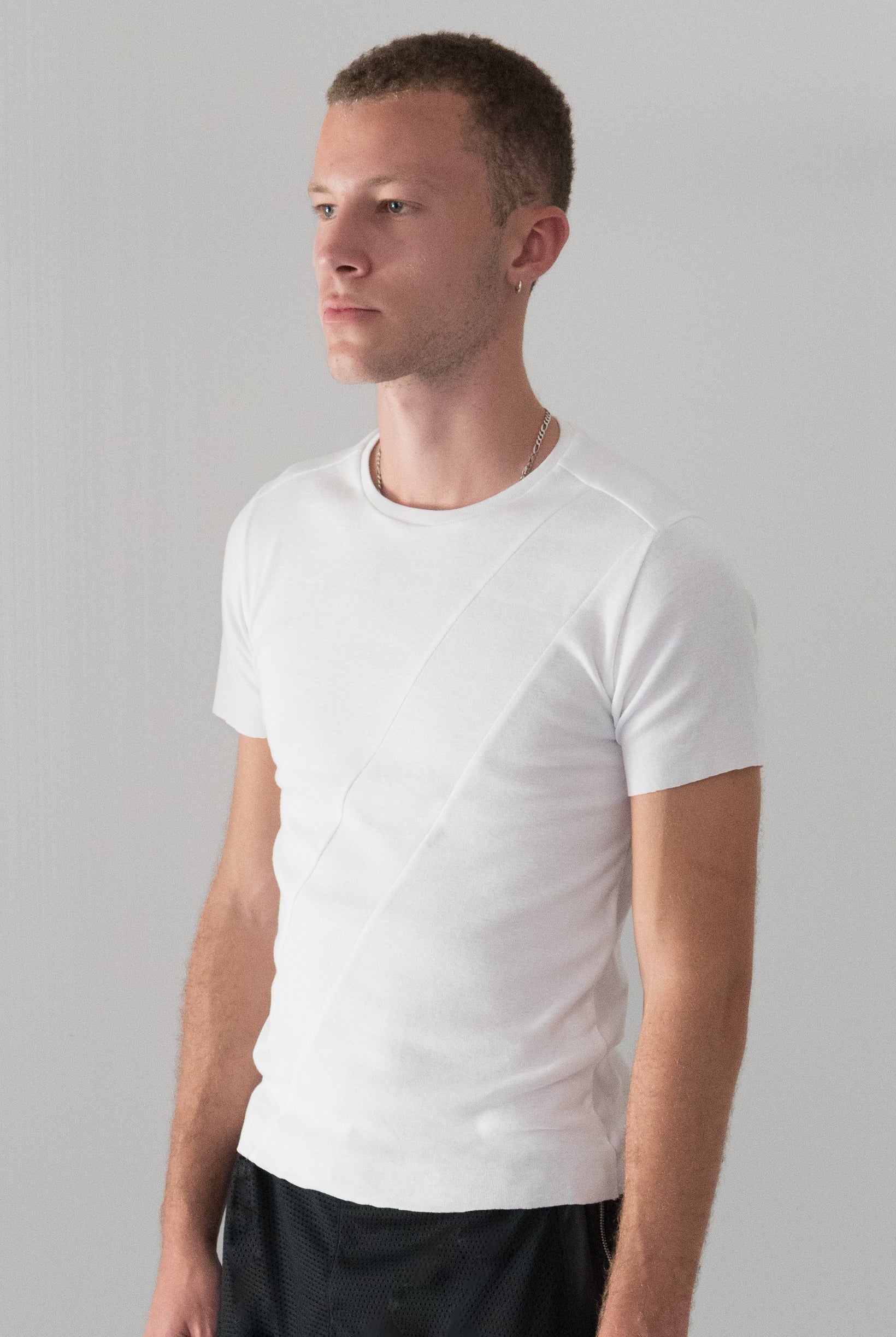 Lightweight cotton rib - slightly slim, straight fit. Diagonal panel across front body.